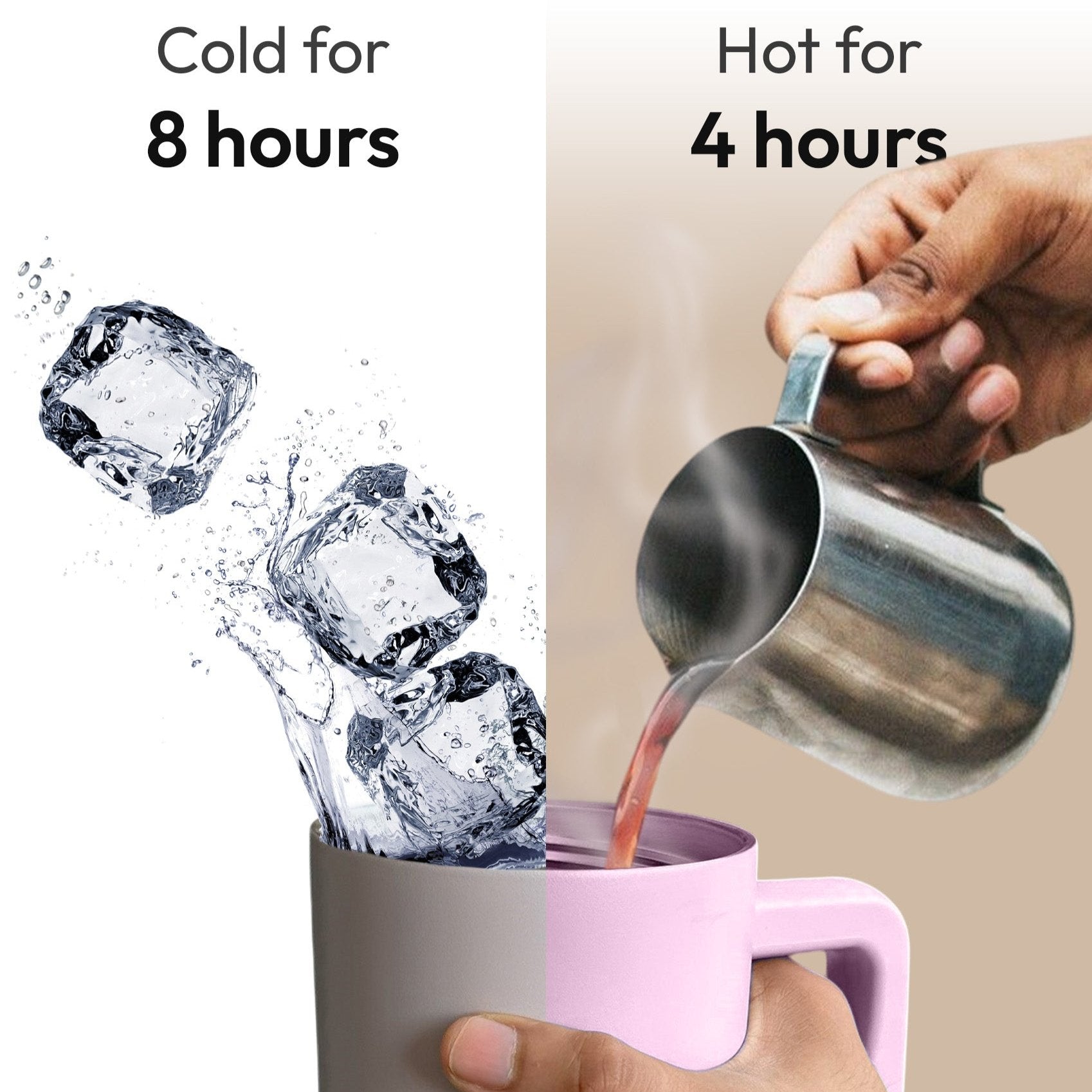 Answer: It keeps drinks cold for up to 8 hours and hot for up to 4 hours, ensuring your beverage stays at the desired temperature for longer.